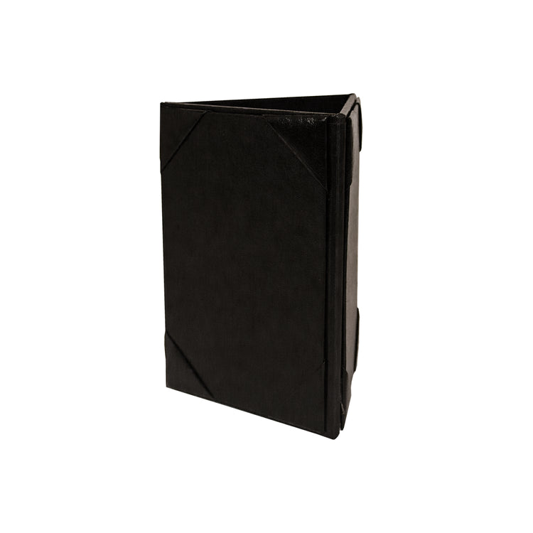 Black, hardback Three-Sided Table Tent produced standard with corner tabs. Comes with a magnetic strip. Clear vinyl sheets included.